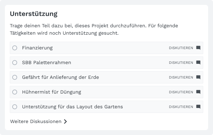 User, die für ihr Projekt praktische Unterstützung brauchen, können dies als Tätigkeiten erfassen. Die einzeln erfassten Tätigkeiten können danach in einer «Diskussion» besprochen werden. Sobald eine Diskussion dazu eröffnet wurde, ist diese dann auch in der Diskussionsliste aufgeführt. Die Projektinitiierenden können zudem abgeschlossene oder geklärte Tätigkeiten abhaken.