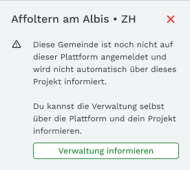 Falls eine Gemeinde nicht auf der Plattform registriert ist, erscheint eine entsprechende Meldung. Das Projekt kann ohne Weiteres veröffentlicht werden. Wenn sich die markierte Gemeinde zu einem späteren Zeitpunkt registriert, kann sie auf das Projekt reagieren. Somit wird sichergestellt, dass keine Projekte verloren gehen.