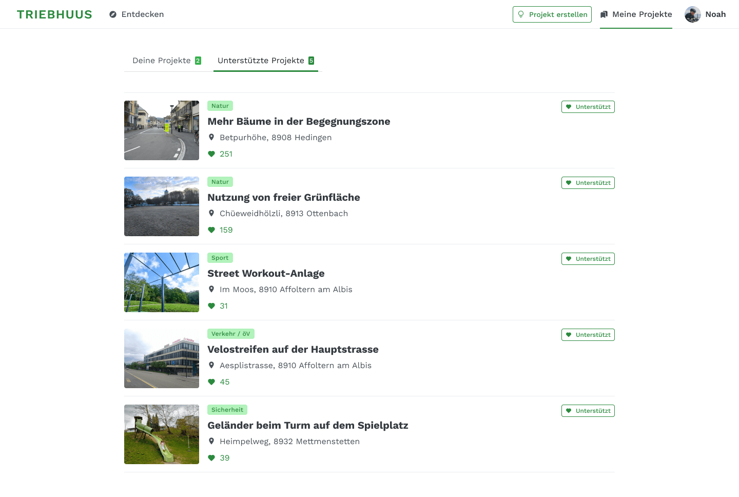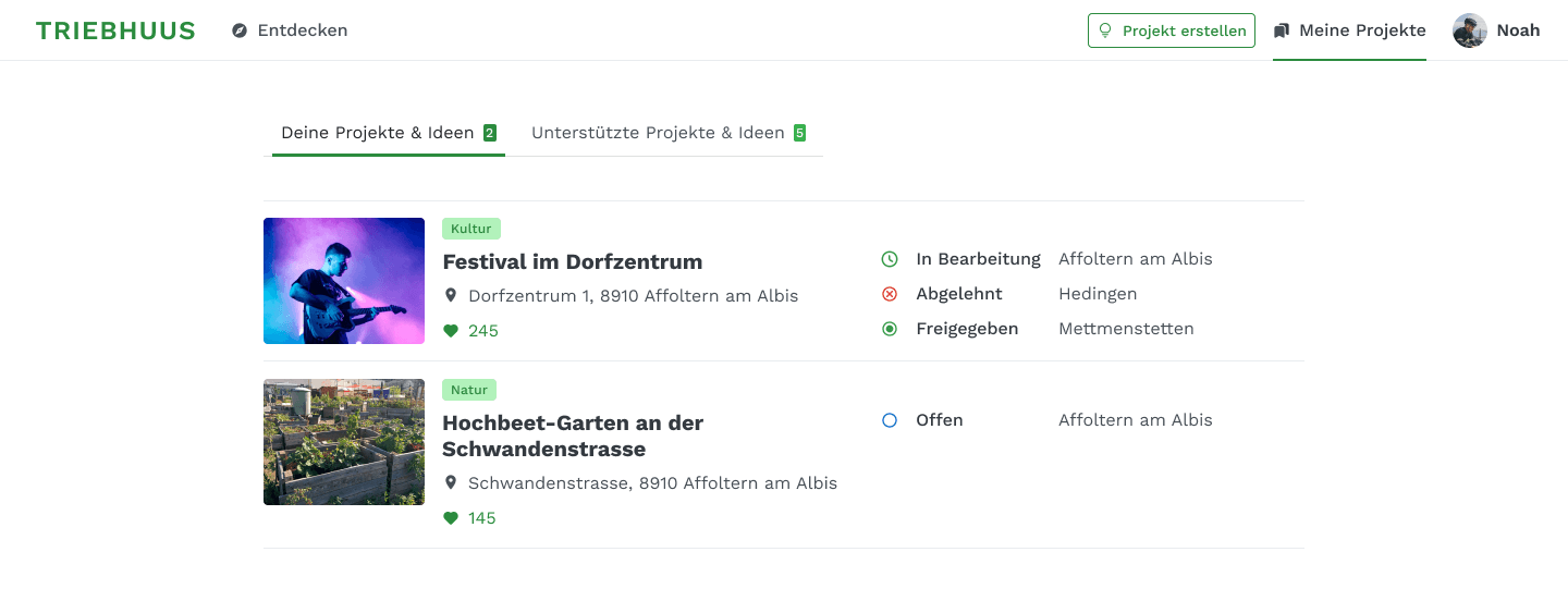 Alle User haben mit der «Meine Projekte» Ansicht, einen Überblick über die eigenen und die unterstützten Projekte.
